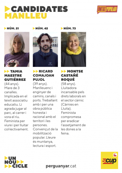 Tres manlleuenques formen part de la candidatura de la CUP – Un Nou Cicle Per Guanyar a la circumscripció electoral de Barcelona. Montserrat Castañé, afiliada a la COS i lluitadora incansable pels drets laborals de les treballadores del sector càrnic amb Càrnies en Lluita, ocupa la posició 73 de la llista; Ricard Comajoan, enginyer de camins, canals i ports i ferm convençut de la mobilització popular com a motor de canvi, el número 42; Tamia Maestre, radicalment feminista i mare de tres canalles implicada en el teixit associatiu educatiu, el lloc 21 de la candidatura que encapçalen Dolors Sabater, Carles Riera i Eulàlia Reguant i tanquen Anna Gabriel, David Fernàndez i Blanca Serra.